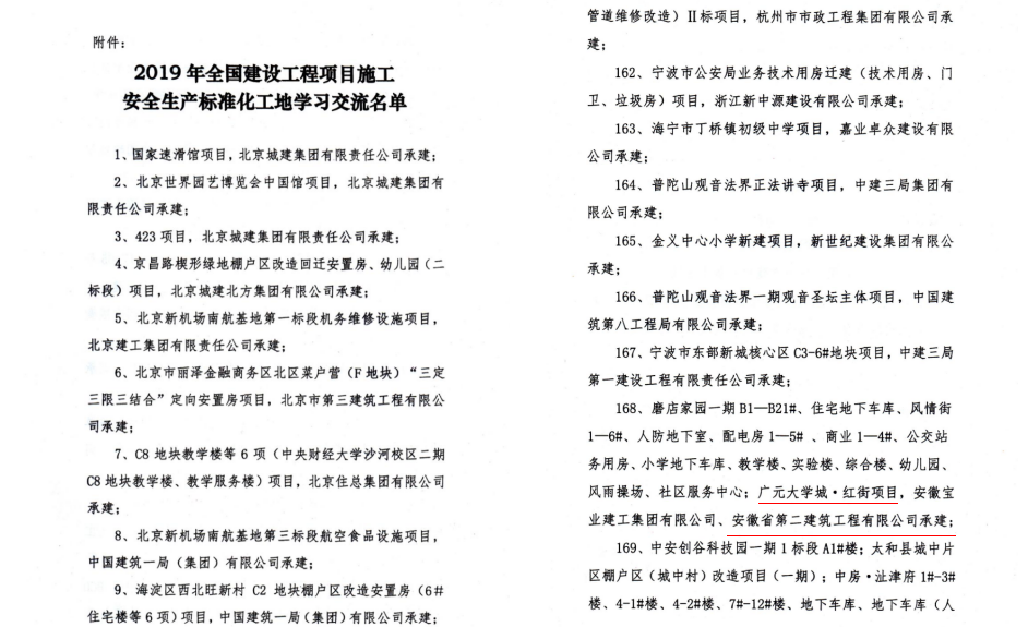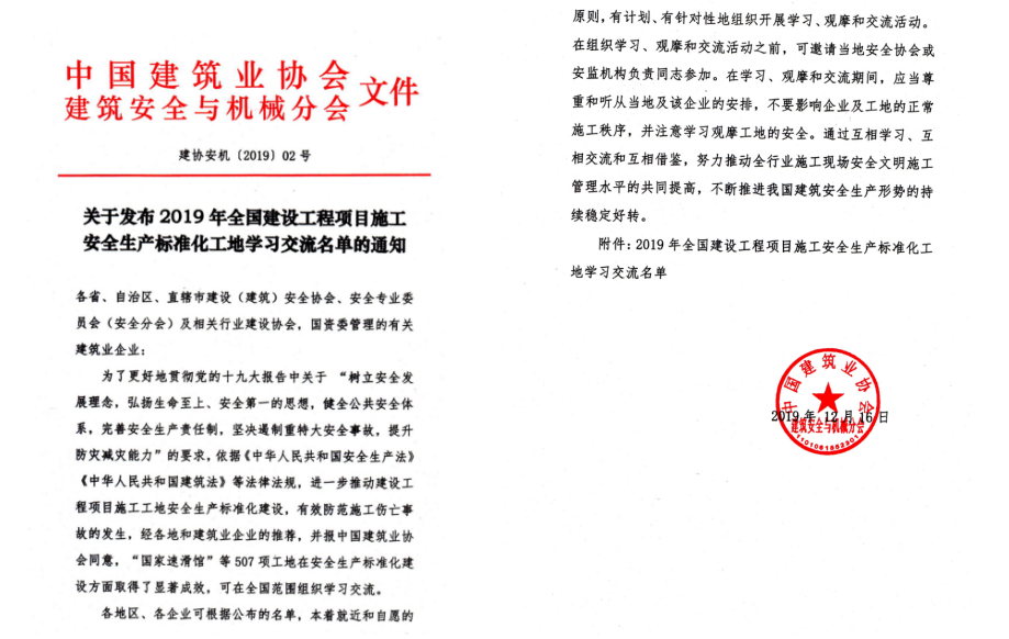 2019年,公司共創(chuàng)建全國(guó)建設(shè)工程項(xiàng)目施工安全生產(chǎn)標(biāo)準(zhǔn)化工地1個(gè),省級(jí)安全生產(chǎn)標(biāo)準(zhǔn)化示范工地8個(gè),市級(jí)安全生產(chǎn)標(biāo)準(zhǔn)化示范工地8個(gè),集團(tuán)公司安全文明標(biāo)準(zhǔn)化示范工地10個(gè),創(chuàng)建項(xiàng)目數(shù)量再創(chuàng)歷史新高,突破了6年來(lái)國(guó)家級(jí)示范工地及省外項(xiàng)目省級(jí)示范工地零的突破。