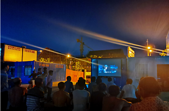 夜幕降臨,放映場上,辛勤勞作一天的工人們聚在一起,平時忙碌的工作,以及住宿條件的限制,每天的“兩點一線”讓他們的業(yè)余生活枯燥而單調(diào),沒有那么豐富,通過在工人生活區(qū)放映電影,讓他們的業(yè)余生活多了一項文化娛樂項目,可以給他們帶來一場文化盛宴。